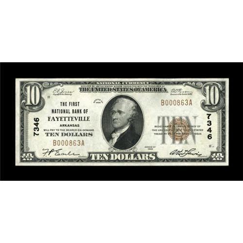 <B>Fayetteville, AR</B></I> - $10 1929 Ty. 1 <B>The First NB</B></I> Ch. # 7346<BR> A beautiful small example displaying amazing original embossing. <B>Choice About Uncirculated.</B></I><BR><BR><b>Shipping:</b> Coins & Currency (<a target="_blank" href="http://www.heritageauctions.com/common/shipping.php">view shipping information</a>)