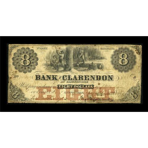 <B>Fayetteville, NC- Bank of Clarendon</B></I> $8 Aug. 1, 1855 G6a<BR> This is only the second time that we have been able to offer this very desirable denomination on this bank. The back reveals a couple of small repairs. <B>Very Good.</B></I><BR><BR><b>Shipping:</b> Coins & Currency (<a target="_blank" href="http://www.heritageauctions.com/common/shipping.php">view shipping information</a>)
