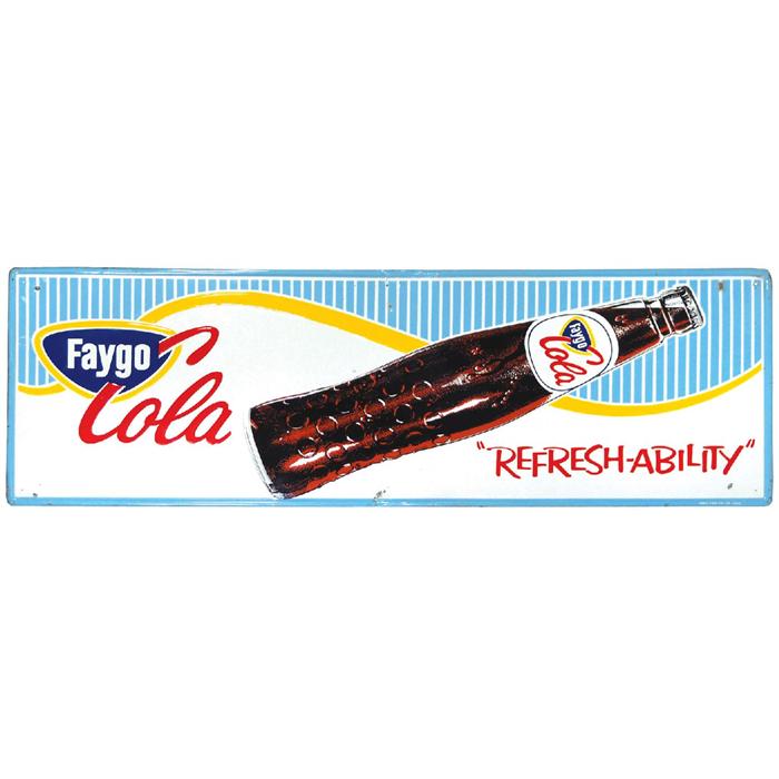 Faygo Cola metal sign, mfgd by Press Sign Co.-St. Louis, VG cond w/a few small holes & dent in middle, 18"H x 54"W.