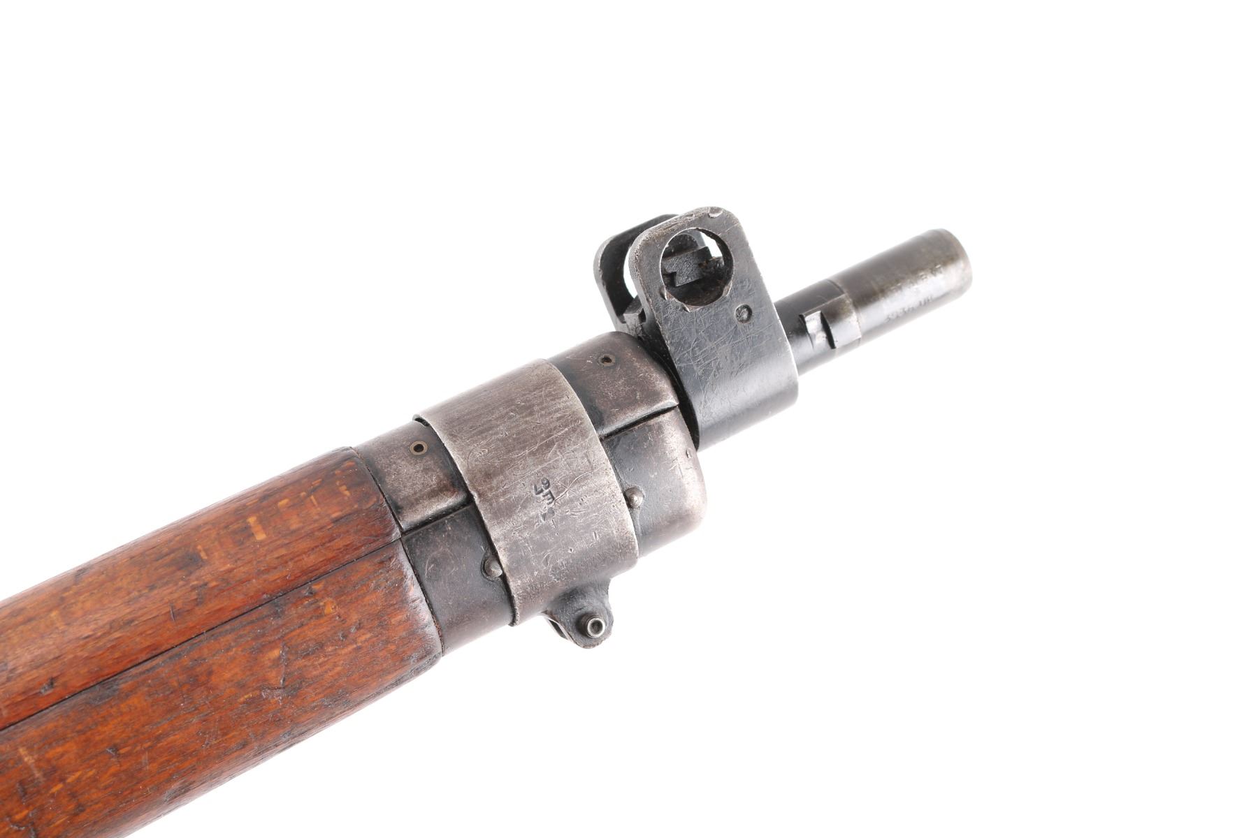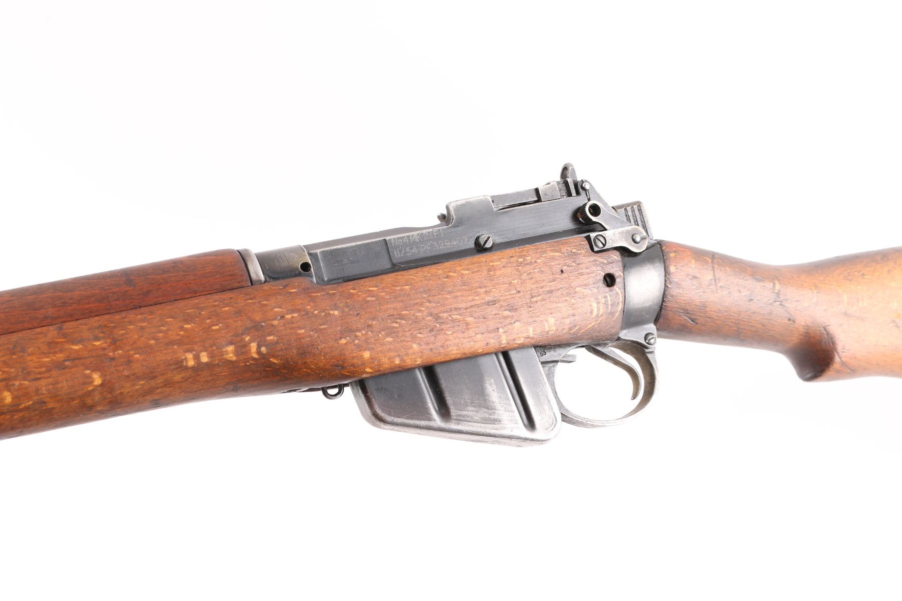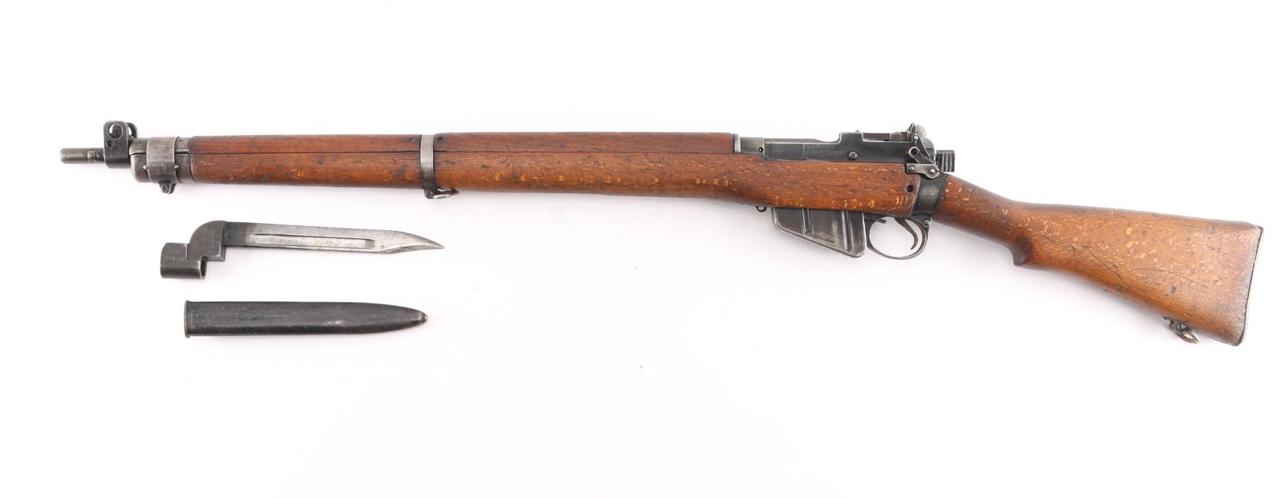 British military bolt action rifle dated 1955, imported by CAI, St Albans VT. Features black finished metal, two piece straight gripped stock with full length handguards, brass buttplate, 25" barrel, bayonet lug, protected blade front sight, rear peep sight with flip-up elevation ladder, sling swivels, detachable 10 round magazine, manual safety. Receiver dated11/54. Bore is fair, strong rifling, dark frosting in the grooves, wood is very good sound, metal has handling/edge wear. Numbers match on receiver, bolt, magazine, Comes with a No. 9 MK I bayonet, scabbard, bayonets serial numbers are matched to the rifle, dated 53.