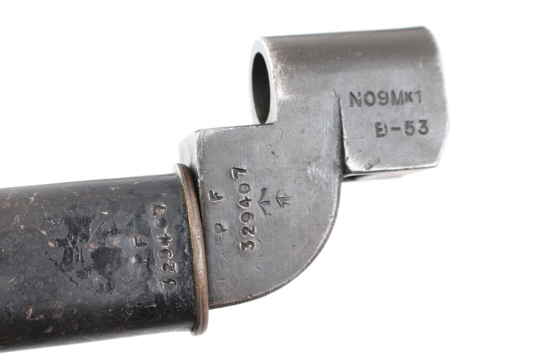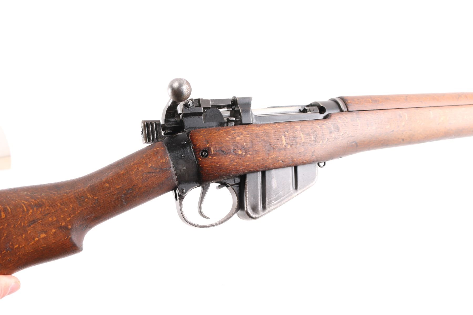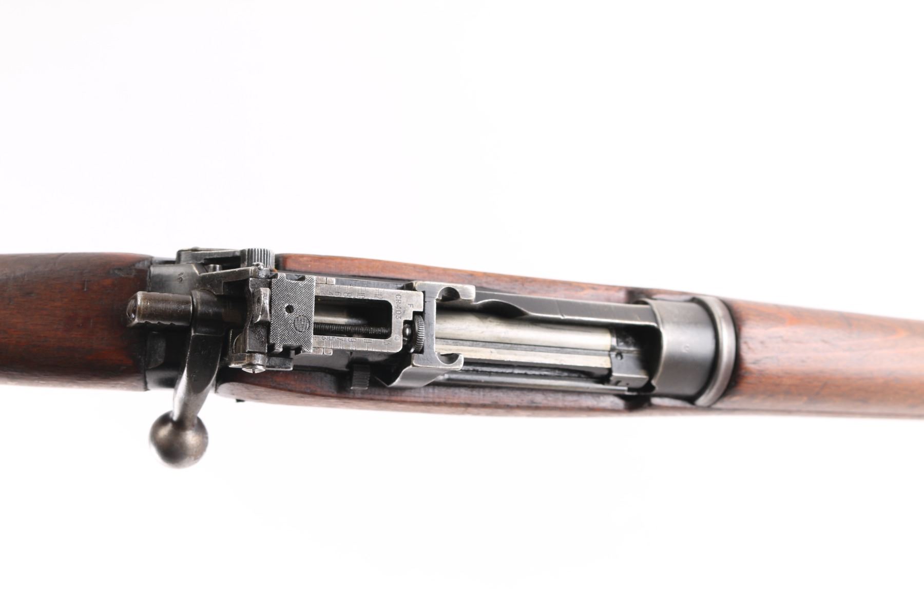 British military bolt action rifle dated 1955, imported by CAI, St Albans VT. Features black finished metal, two piece straight gripped stock with full length handguards, brass buttplate, 25" barrel, bayonet lug, protected blade front sight, rear peep sight with flip-up elevation ladder, sling swivels, detachable 10 round magazine, manual safety. Receiver dated11/54. Bore is fair, strong rifling, dark frosting in the grooves, wood is very good sound, metal has handling/edge wear. Numbers match on receiver, bolt, magazine, Comes with a No. 9 MK I bayonet, scabbard, bayonets serial numbers are matched to the rifle, dated 53.