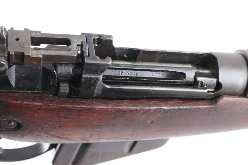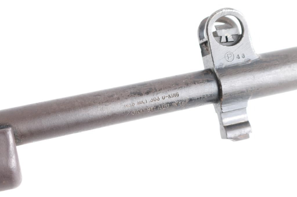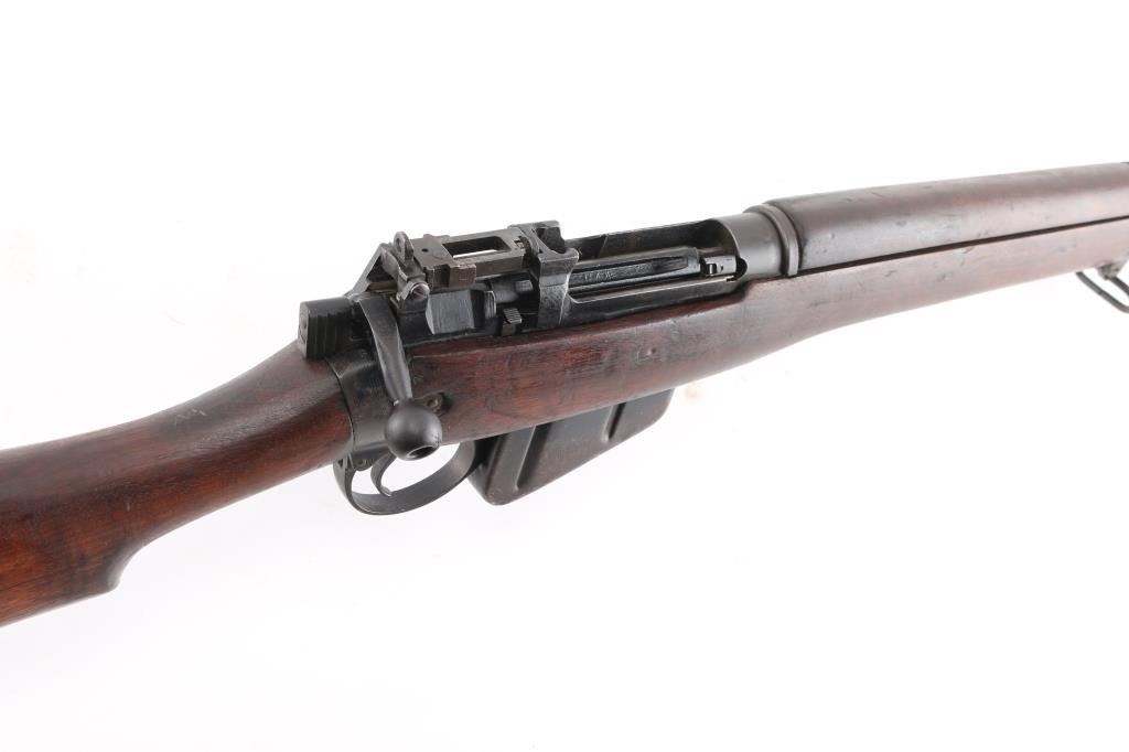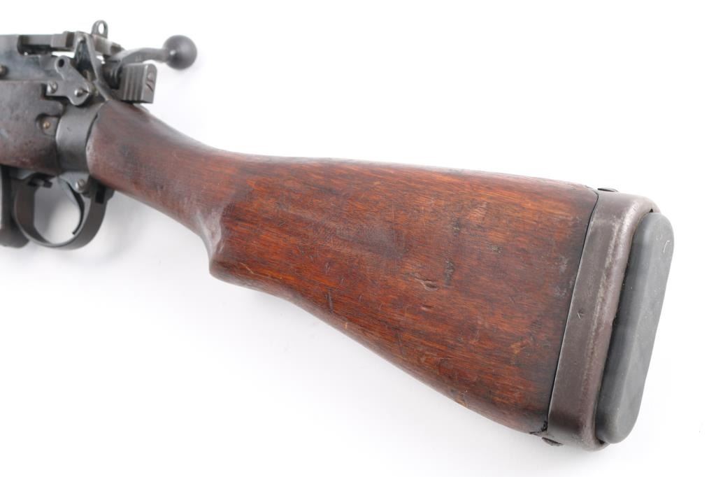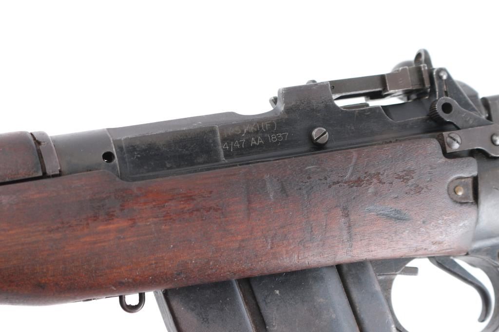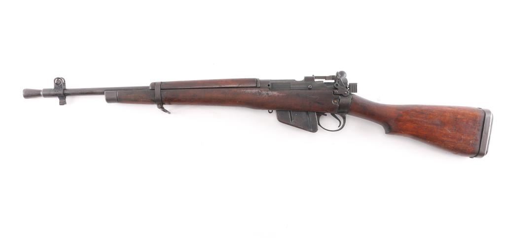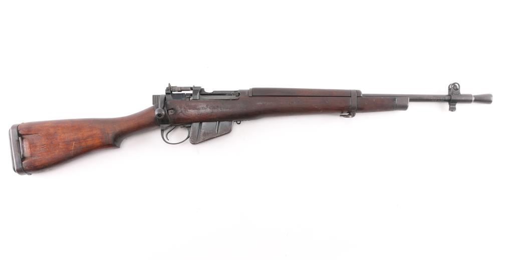 'Jungle Carbine'. British military magazine fed bolt action service rifle chambered in .303 British, manufactured at the Royal Ordnance Factory in Fazakerley, Liverpool circa 1947. Features a matte black finish, 20.5" barrel, dovetailed front sight base with protective sight ears, cone style flash suppressor & bayonet lug, dovetailed patridge front sight, receiver mounted folding aperture sight graduated to 800 meters, smooth trigger, manual safety on the left side of the receiver, 10 round detachable magazine, sling points, hollowed bolt handle, steel buttplate with rubber recoil pad, and smooth wood stocks, Import marks on barrel. Left receiver rail marked "No. 5 MK I (F) 4/47 AA1837", British proofs and broad arrow marks,. Rifle retains most of its black painted finish turning a brown patina with edge wear, and handling loss. Action is smooth, the bore is good with strong rifling, a couple of spots of pitting. The wood stocks are very good/sound