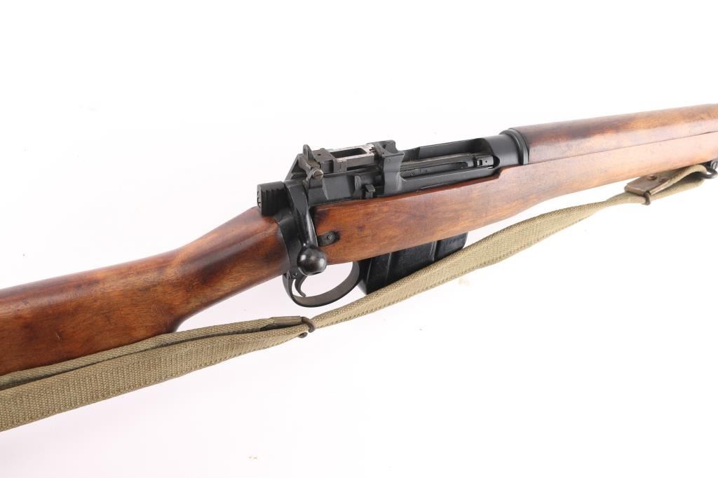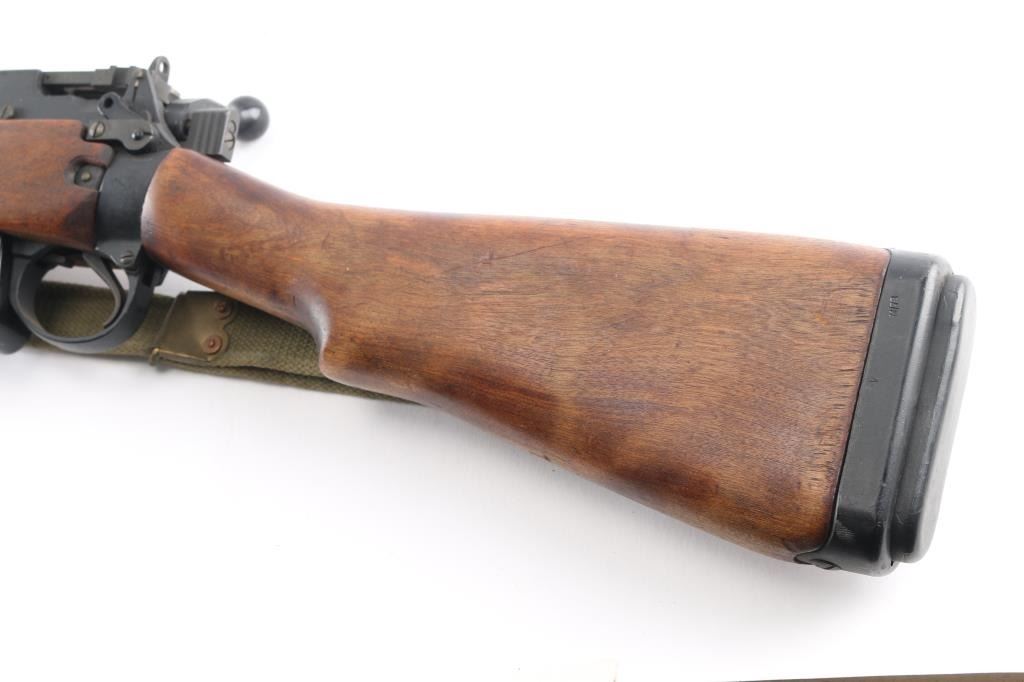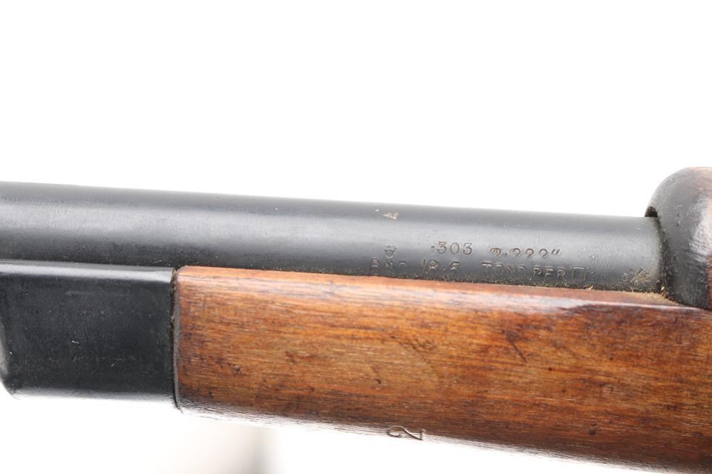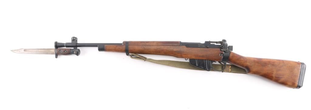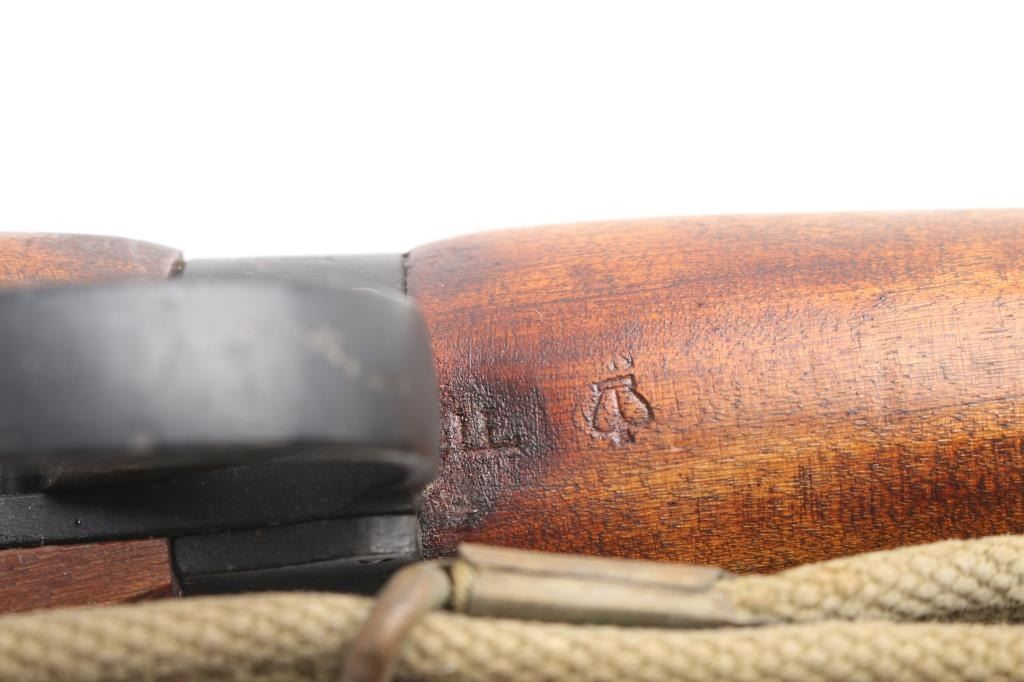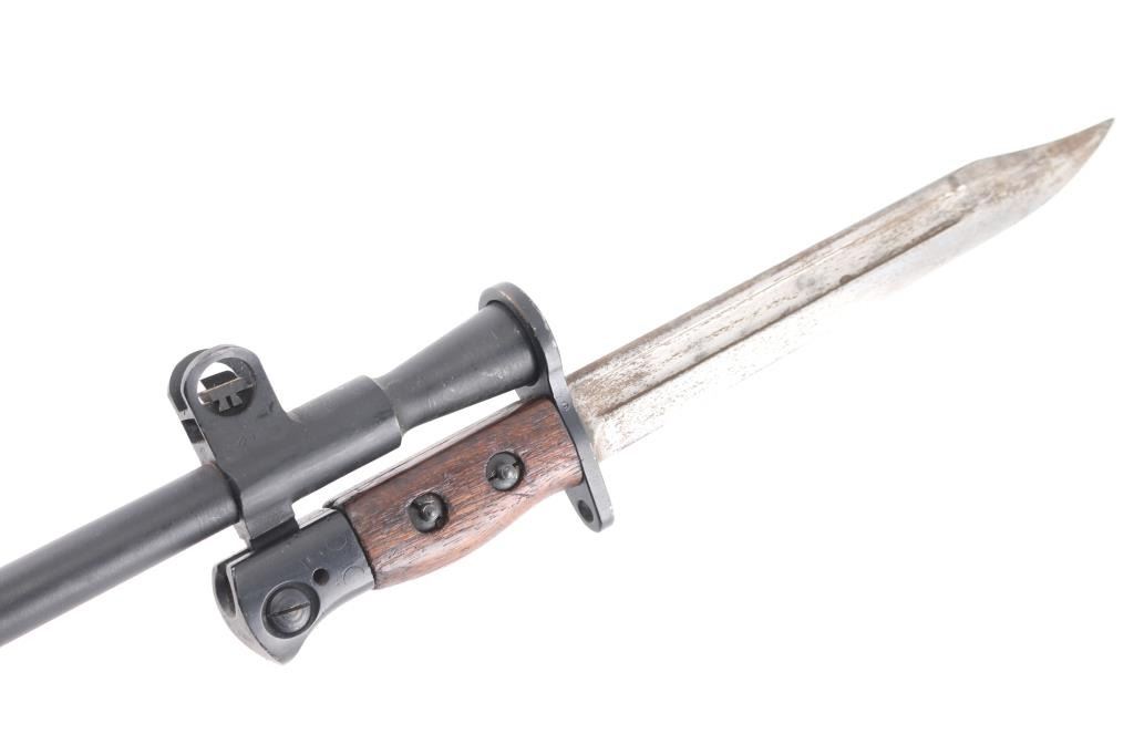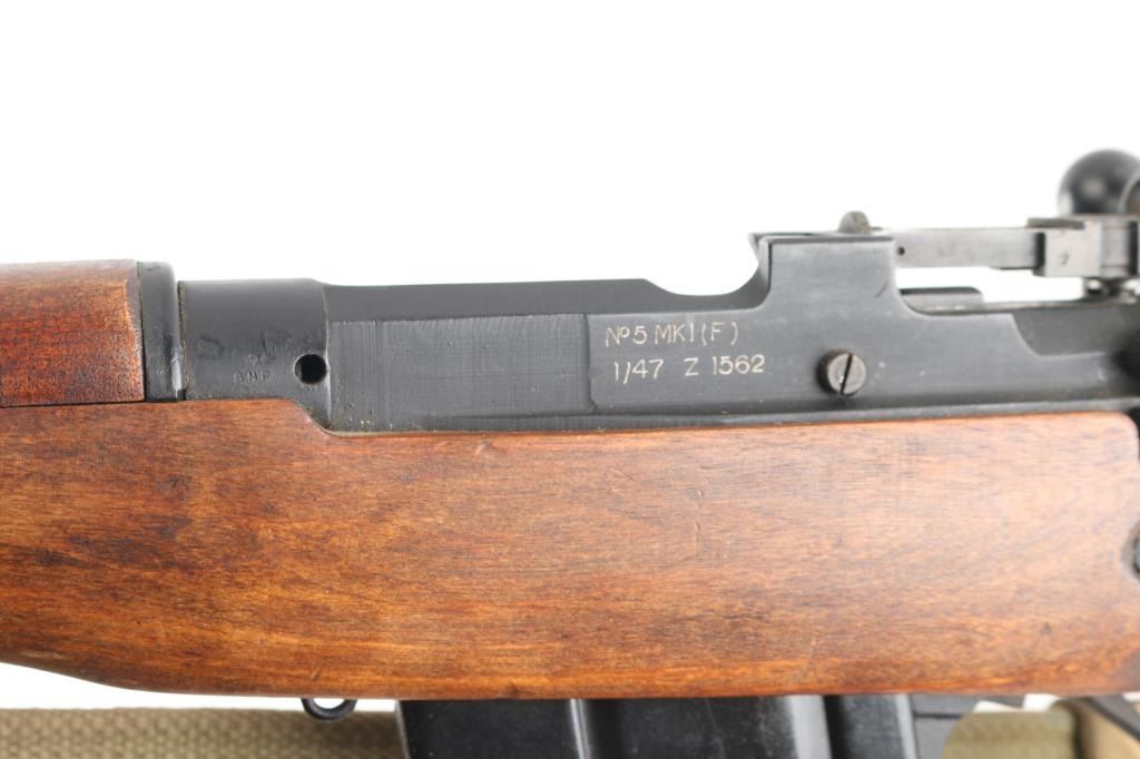 Jungle Carbine' British military magazine fed bolt action service rifle chambered in .303 British, manufactured at the Royal Ordnance Factory in Fazakerley, Liverpool circa 1947. Features a black painted finish, 20.5" barrel, pinned front sight base with protective sight ears, cone style flash suppressor & bayonet lug, dovetailed patridge front sight, receiver mounted, screw adjustable, folding aperture sight graduated to 800 meters, smooth trigger, manual safety on the left side of the receiver, 10 round detachable magazine, sling points, hollowed bolt handle, steel buttplate with rubber recoil pad, and smooth wood stocks, no import marks have been observed. Left receiver rail marked "No. 5 MK I (F) 5/47 Z1562", right chamber has British proof, "crown over BMP". Serial number matched on receiver, magazine, stock, and bolt handle. Rifle retains approximately 99% of its black painted finish, bore is excellent/bright, wood is excellent, action is smooth. Like new condition. Comes with Original No. 5 bayonet, maker marked, proofs on the pommel, no scabbard, some light surface rust on the clip point 7 3/4" blade.