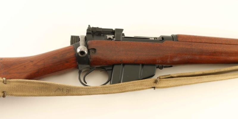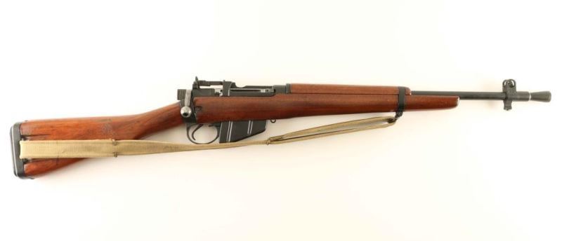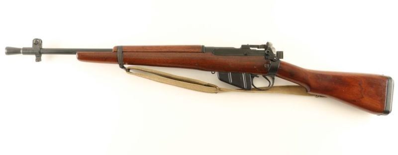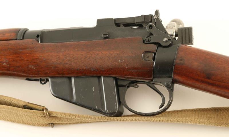 'Jungle Carbine' British military magazine fed bolt action service rifle chambered in .303 British, manufactured circa 1945. Features a black painted finish, 20.5" barrel with cone style flash suppressor & bayonet lug, shrouded patridge front sight, flip-up aperture rear sight graduated to 800 meters, smooth trigger, manual safety on the left side of the receiver, 10 round detachable magazine, canvas sling, hollowed bolt handle, 'lightning cuts' on the receiver & barrel, rubber recoil pad, and three-piece smooth wood stocks. The left side of the receiver is marked "No5MK1ROF (F)/9/45 Q9965 and the barrel has nitro proof marks. Rifle retains approximately 95% of it's black paint finish showing scattered losses on the barrel & flash hider. Action is smooth, the bore is very good and the wood stocks are very good Condition is NRA Very Good+++. ***C&R Firearm*** From The John F Sukey Collection