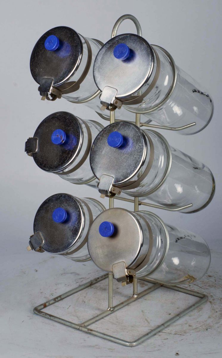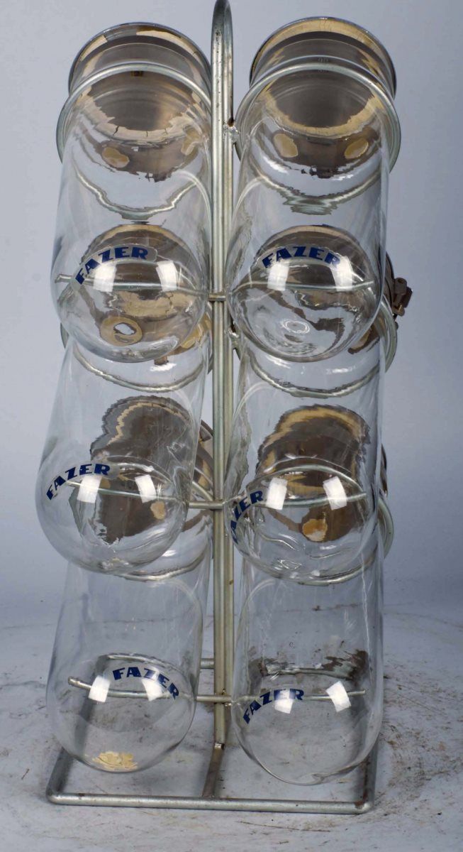 Includes 6 Fazer jars with metal lids for storage and display. Condition (Excellent). Size 25" x 10.25" x 13.5"