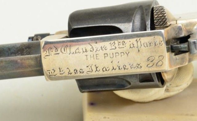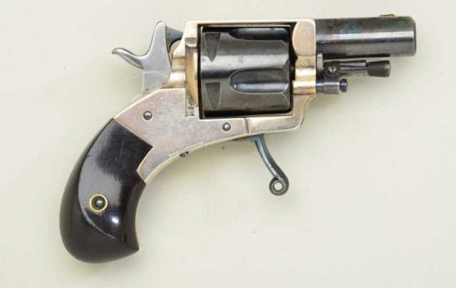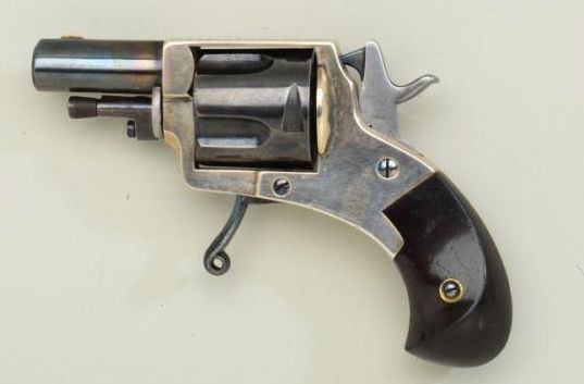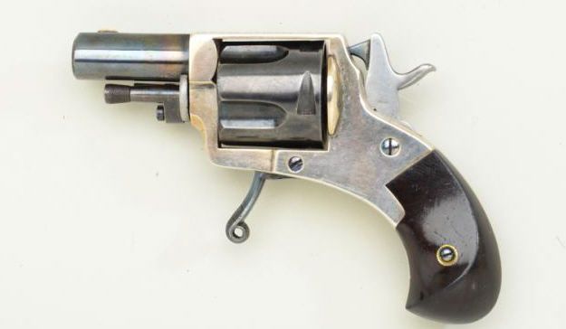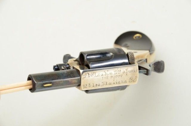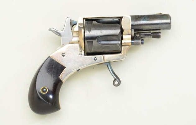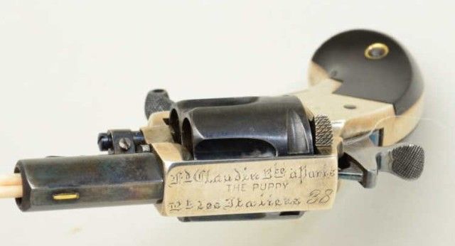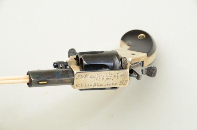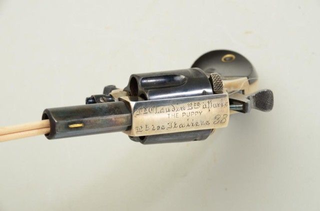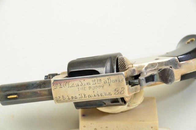 Fd. Claudin bte-Paris marked pocket revolver as marked “ The Puppy” with address Bd. Des Italieas 38 blue and silver with varnished wood grips. Fine to excellent condition. Approx. 7.65mm centerfire, 4-3/4” overallwith 1-3/8” barrel s and folding trigger. Fine to excellent condition circa 1880’s -1890’s. Exceptional. Est.; $600-$1,200