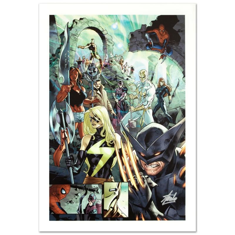 A piece of comic book history, this limited edition, from original art by Stuart Immonen, depicts classic Marvel characters. Stuart Immonen is a Canadian comic book artist. He is best known for his work on Nextwave, Ultimate X-Men, The New Avengers and Ultimate Spider-Man. Immonen studied at Toronto's York University, pursuing a career in art. In 1988, he self-published a series called Playground; it was his first published work. He worked at several smaller comic book companies before being hired by DC Comics and Marvel Comics in 1993. "Fear Itself #7" is a limited edition giclee on canvas by Stuart Immonen presented by Marvel Comics, numbered and hand signed by the great Stan Lee! Includes Certificate of Authenticity! Measures approx. 18" x 27" (image).