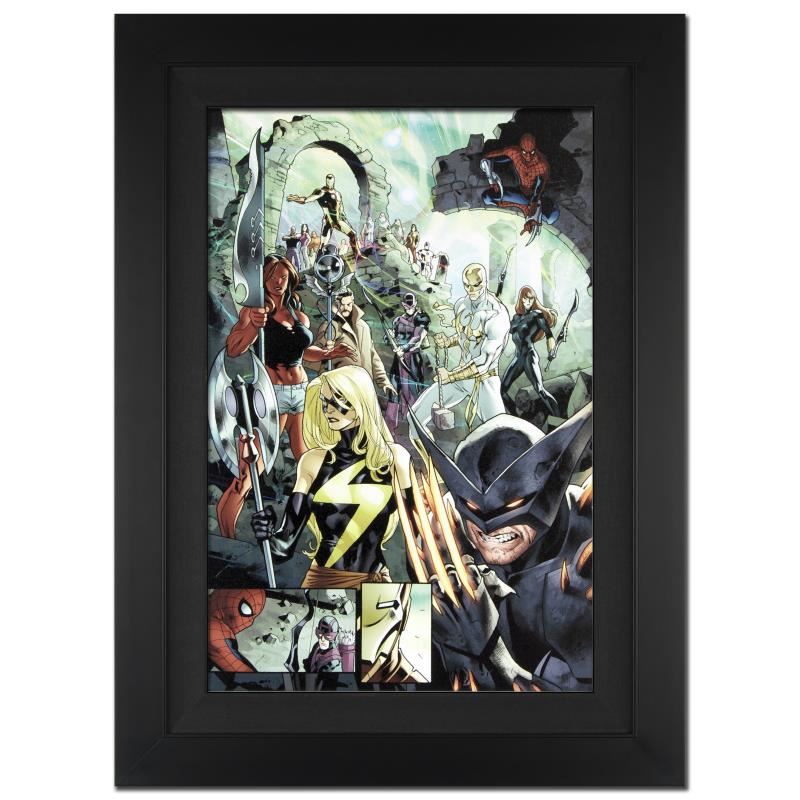 A piece of comic book history, this limited edition, from original art by Stuart Immonen, depicts classic Marvel characters. Stuart Immonen is a Canadian comic book artist. He is best known for his work on Nextwave, Ultimate X-Men, The New Avengers and Ultimate Spider-Man. Immonen studied at Toronto's York University, pursuing a career in art. In 1988, he self-published a series called Playground; it was his first published work. He worked at several smaller comic book companies before being hired by DC Comics and Marvel Comics in 1993. "Fear Itself #7" is an extremely limited edition numbered giclee on canvas by Stuart Immonen presented by Marvel Comics, hand signed by the great Stan Lee and numbered out of only 10! This piece is custom framed and ready to hang. Includes Certificate of Authenticity! Measures approx. 25" x 34" (with frame), 18" x 27" (image).
