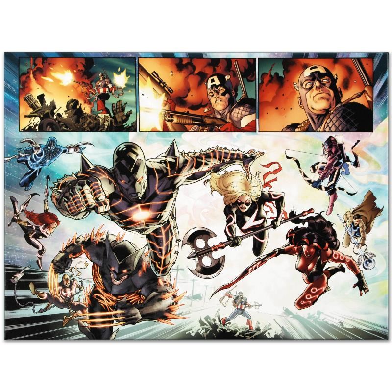 A piece of comic book history, this limited edition, from original art by Stuart Immonen, depicts classic Marvel characters. Stuart Immonen is a Canadian comic book artist. He is best known for his work on Nextwave, Ultimate X-Men, The New Avengers and Ultimate Spider-Man. Immonen studied at Toronto's York University, pursuing a career in art. In 1988, he self-published a series called Playground; it was his first published work. He worked at several smaller comic book companies before being hired by DC Comics and Marvel Comics in 1993. "Fear Itself #7" is a limited edition giclee on canvas by Stuart Immonen presented by Marvel Comics! This piece comes gallery wrapped. Includes Certificate of Authenticity! Measures approx. 24" x 18" (image).