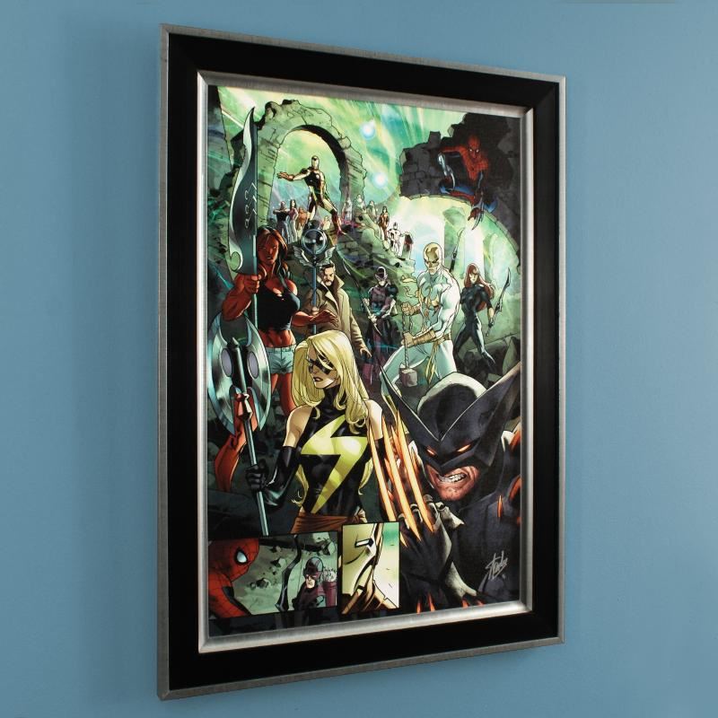 A piece of comic book history, this limited edition, from original art by Stuart Immonen, depicts classic Marvel characters. Stuart Immonen is a Canadian comic book artist. He is best known for his work on Nextwave, Ultimate X-Men, The New Avengers and Ultimate Spider-Man. Immonen studied at Toronto's York University, pursuing a career in art. In 1988, he self-published a series called Playground; it was his first published work. He worked at several smaller comic book companies before being hired by DC Comics and Marvel Comics in 1993. "Fear Itself #7" is an extremely limited edition numbered giclee on canvas by Stuart Immonen presented by Marvel Comics, hand signed by the great Stan Lee and numbered out of only 10! This piece is custom framed and ready to hang. Includes Certificate of Authenticity! Measures approx. 25" x 34" (with frame), 18" x 27" (image).