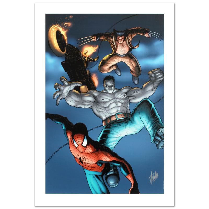 A piece of comic book history, this limited edition artwork, drawn by Simon Bisley, depicts the classic characters Spider-Man, The Hulk, Wolverine, and Ghost Rider. British comic book artist Simon Bisley has done work on such franchises as X-Men and the Incredible Hulk. "Fear Itself: Fearsome Four #2" is a limited edition giclee on canvas by Simon Bisley presented by Marvel Comics, numbered and hand signed by the great Stan Lee! Includes Certificate of Authenticity! Measures approx. 18" x 27" (image).