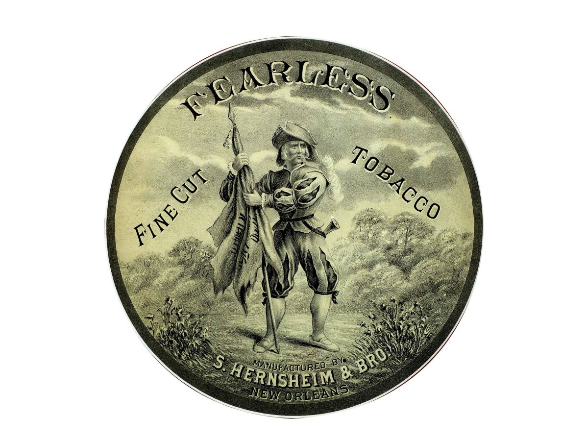 Fearless Fine Cut Tobacco Label. Mfg. by S. Hernsheim & Bro New Orleans. Excellent condition, framed under glass. 11 inch diameter image only.