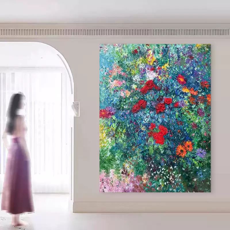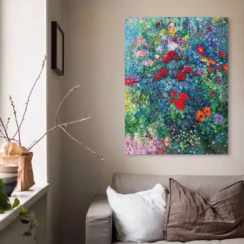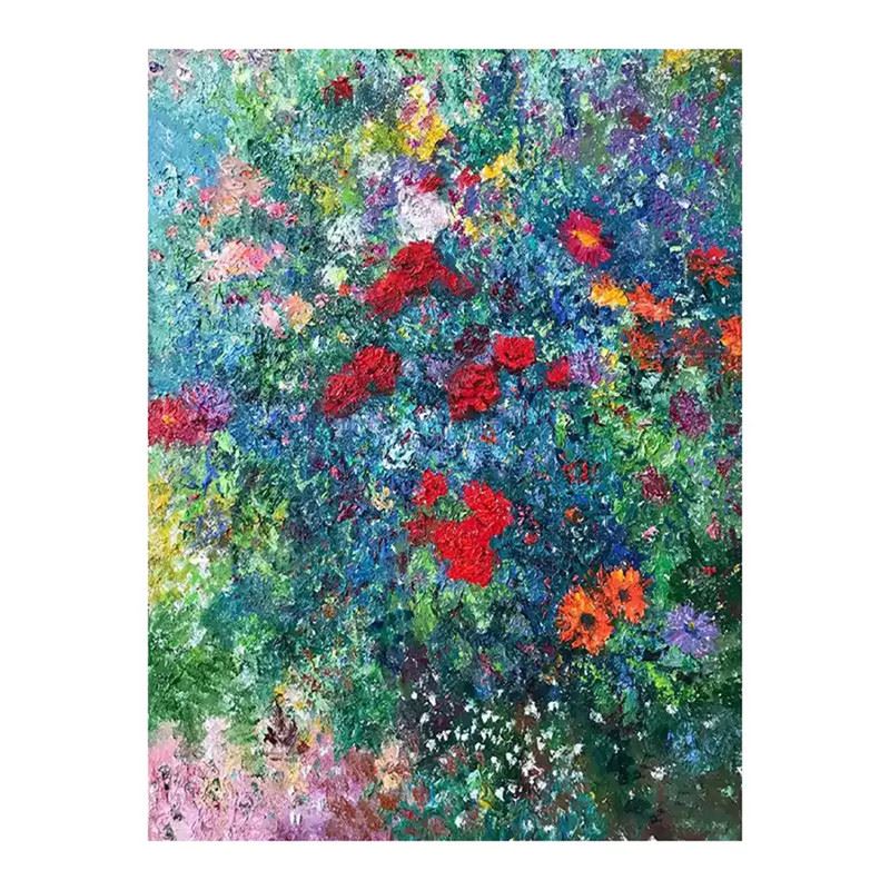 A lush sea of blossoms spills across the canvas, where crimson, sapphire, and violet collide amid vivid greens like a grand feast for spring. Thick, lively strokes make it feel as if the breeze and fragrance of the flowers have been captured in a single radiant moment. Dimensions: 24 x 31 inches.