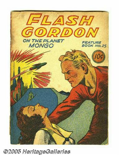 <B>Feature Books #25 Flash Gordon on the Planet Mongo (David McKay, 1941) Condition: FR/GD.</B></I> Beautiful deep colors. Appears as though some attempt to restore the spine split was made on this scarce copy, and it was not completely done. Covers held intact to each other but detached from main body of comic. The covers still possess a spine split with the remaining spine appears to be glued or held together quite firmly. Some paper loss to spine does exist, but not to the front cover. All interior pages are present with the last page advertisement for other <B>Feature Books</B></I> having Flash Gordon penciled in by the previous owner. Presents well for the grade. Overstreet 2005 GD 2.0 value = $112. <I>From the Larry Jacobs Collection.</B></I>