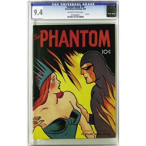 <B>Feature Books #39 (David McKay, 1944) CGC NM 9.4 Off-white to white pages.</B></I> Lee Falk's costumed crimefighter has appeared in the comics of many different publishers over the years; this is one of six Phantom appearances in <B>Feature Books</B></I>. Overstreet 2006 NM- 9.2 value = $660. CGC census 2/06: 1 in 9.4, 1 higher. <I>From the Collection of Harold Curtis.</B></I>
