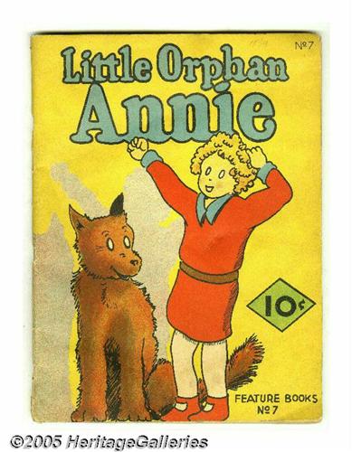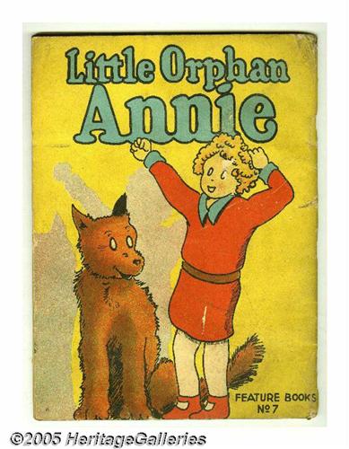 <B>Feature Books #7 Little Orphan Annie (David McKay, 1937) Condition: FN.</B></I> A seldom-seen issue, and the only <B>Little Orphan Annie</B></I> title in the series. Beautiful deep colors on the cover reflecting Annie and her dog Sandy. Small half-inch spine separation at the bottom, spine is tight otherwise. Interior pages are tanned and nice. Back cover shows eraser size paper loss on Annie and some bumping and nicks to the spine. The front cover has "1934" written in pencil. A very nice example of this hard to find book; Overstreet describes it as "rare." Overstreet 2005 FN 6.0 value = $288. <I>From the Larry Jacobs Collection.</B></I>
