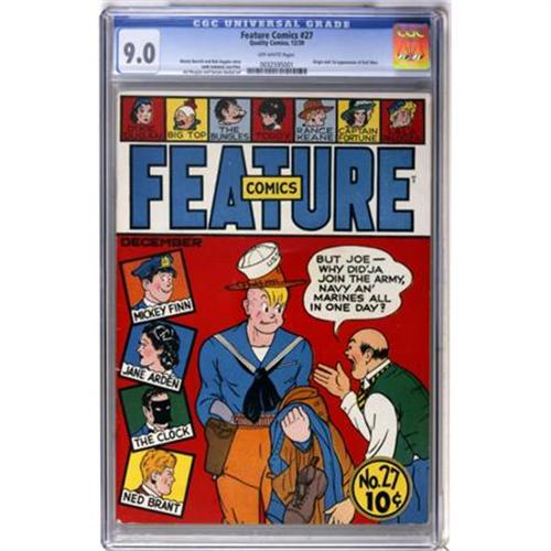 <B>Feature Comics #27 (Quality, 1939) CGC VF/NM 9.0 Off-white pages.</B></I> The sixth issue of Quality Comics Group's first comic title is considered "rare" by Overstreet. CGC's census seems to bear that out, with only four copies certified to date. Even more amazing is that no other copy has been certified nicer than VG 4.0! It's also the most valuable in the run because it has the origin and first appearance of Doll Man. The cover colors are striking on this 67-year old Marvel. Lou Fine contributed interior art. Overstreet 2007 VF/NM 9.0 value = $5,294; NM- 9.2 value = $7,500. CGC census 5/07: 1 in 9.0, none higher.<BR><BR><b>Shipping:</b> Comics - Slabbed (certified) (<a target="_blank" href="http://www.heritageauctions.com/common/shipping.php">view shipping information</a>)