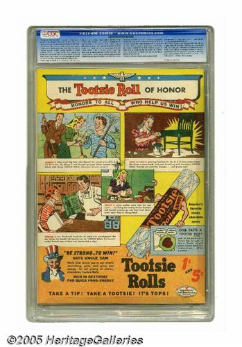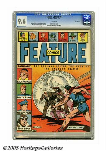 <B>Feature Comics #64 San Francisco pedigree (Quality, 1943) CGC NM+ 9.6 White pages.</B></I> The Doll Man takes center stage on this issue, using spare change to bring down the bad guys! The oversized image of a 25¢ piece on this Al Bryant cover is striking, and should appeal to those who collect coins as well as comic books. Even more striking is the remarkable condition of this 62-year-old book, one of a number of incredible San Francisco pedigreed books we are offering in this sale. This choice copy is currently the only example of issue #64 to be graded by CGC. Overstreet 2005 NM- 9.2 value = $290. CGC census 7/05: 1 in 9.6, none higher.