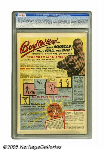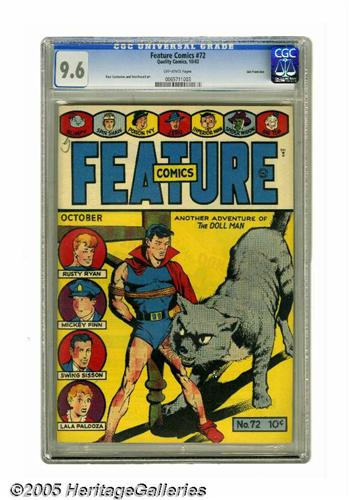 <B>Feature Comics #72 San Francisco pedigree (Quality, 1943) CGC NM+ 9.6 Off-white pages.</B></I> When you're only a few inches tall, a common housecat can really mean trouble! That's Dollman's situation on this issue's cover. There's certainly no trouble identifying this uncommon copy as one of the best in existence, though -- just check with CGC. Not only is this the highest graded example, it's the <I>only</B></I> copy currently residing in CGC's census report for issue #72! Overstreet 2005 NM- 9.2 value = $235. CGC census 7/05: 1 in 9.6, none higher.