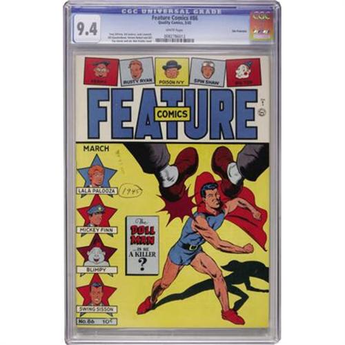 <B>Feature Comics #86 San Francisco pedigree (Quality, 1945) CGC NM 9.4 White pages.</B></I> Only the Mile High copy has been graded higher by CGC at NM+ 9.6. Pristine white pages are typical for the San Francisco Collection. Alex Kotsky cover. Gill Fox art. Overstreet 2007 NM- 9.2 value = $185. CGC census 6/07: 1 in 9.4, 1 higher.<BR><BR><b>Shipping:</b> Comics - Slabbed (certified) (<a target="_blank" href="http://www.heritageauctions.com/common/shipping.php">view shipping information</a>)