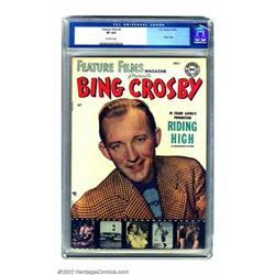 Feature Films #2 (DC, 1950) CGC VF 8.0 Off-white pages. Photo covers were the rage for several titles of the day, but DC's entry, Feature Films, would run for only four issues. The Old Crooner, Bing Crosby, poses for this cover, promoting his movie Riding High, directed by the great Frank Capra. Lots of white on both the front and back covers, and it still looks clean and bright. Just an impact dent on the back, some stress at the front spine bottom, and slightly blunted corners keep this from scoring an even higher grade. Overstreet 2002 VF 8.0 value = $426. Important notice: We expect to be auctioning lots at the rate of 200-250 per hour. Sometimes eBay Premier live bid software cannot keep up with that pace, so we strongly recommend that you place a realistic proxy bid now as insurance to avoid disappointment. Also please note that all Heritage/CAA lots purchased through eBay Premier carry a 20% Buyer's Premium. Please make sure you read the Terms and Conditions.
