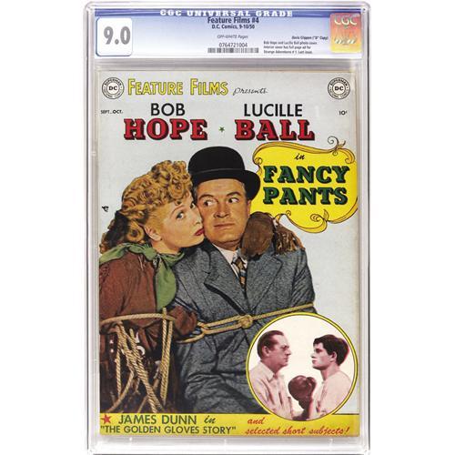 <B>Feature Films #4 Davis Crippen ("D" Copy) pedigree (DC, 1950) CGC VF/NM 9.0 Off-white pages.</B></I> The final issue of this short-lived series, featuring a photo cover with Bob Hope and Lucille Ball. Gerber rates it an "6", or "uncommon" and this is the first copy we've ever offered as well as the only one graded by CGC to date. Overstreet 2006 VF/NM 9.0 value = $721; NM- 9.2 value = $985. CGC census 7/06: 1 in 9.0, none higher. <I>From the Crippen Collection.</B></I> <BR><BR><B>Important notice:</B> Heritage usually auctions material at the rate of 200-250 lots per hour. On some occasions eBay Live bid software or the Internet may not be able to keep up with the pace of the auction. We recommend placing a realistic absentee bid now as insurance to avoid disappointment. Occasionally the auctioneer may eliminate or reject an eBay Live bid, and the auctioneer may also reopen a lot after the close of the eBay live bidding (usually because we missed an audience bid), and may reject your bid even if it shows you as the winning bidder. By bidding via eBay Live, you agree that Heritage may award the lot to another bidder at its sole discretion under the circumstances described above or any other reasonable circumstances. Since eBay bids are not shown to us until we open the lot on the floor, we treat those bids just like floor bids. In most cases the floor responds before the eBay bid is presented to us, due to Internet lag time, so for consistency we have made it a policy that floor bids are always considered first over tie eBay live bids. Also please note that all Heritage lots purchased through eBay Live carry a 22.5% Buyer's Premium. Please make sure you read the Terms and Conditions before you bid. This lot is being auctioned in conjunction with a live floor auction by Heritage Auction Galleries. All final auction and invoice information will be supplied by Heritage Auction Galleries, and all other information should be considered preliminary. Lot:41001 <BR><BR><B>Winning Notification and Billing:</B> After the FINAL session in this auction is complete, Heritage will send e-mail and snail mail invoices. This process normally takes several days. All final auction and invoice information will be supplied by Heritage Auction Galleries, and all other information should be considered preliminary. <BR><BR>This auction will be conducted on a live auction floor and over the Internet through eBay Live. If you choose to place an absentee bid, please take a moment to <font color='#0000ff'><u><a href='http://pages.ebay.com/liveauctions/help/before/laabsentee.html'>learn how eBay Live absentee bidding works</a></u></font><font color='#000000'>