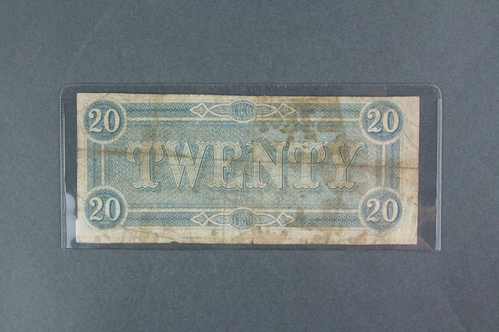 Feb 17th 1864 Confederate States of America $20 bill; has a picture of the Tennessee State Capitol in the center with a pink overprint; a picture of Alexander H. Stephens in the lower right corner; printed on plain paper with pink and black ink on the front and blue ink on the back; 7.8 cm x 18 cm