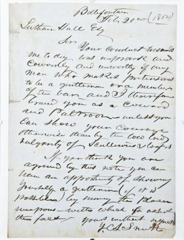 Feb 20th 1854, challenge Lutham Hall, Esq. by W. C. S. Smith at Belle Foutain. Mr. Smith calls Hall a coward and a poltroon, unless he shows the courage to choose weapons. Signed “Yours without respect”. The letter is in good condition, fully legible, and shows some slight folding and staining. From the William R. Orbelo Collection. Est: $250 - $500