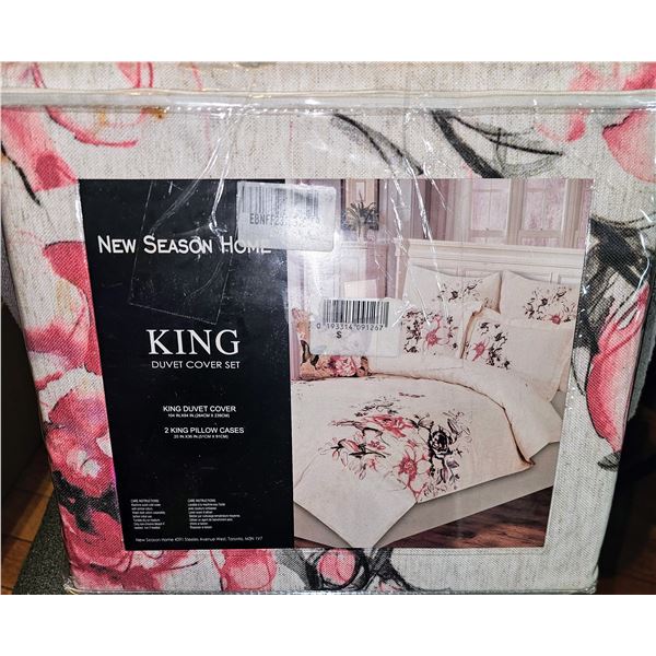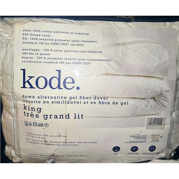 King-size gel fiber duvet, hypoallergenic with 240 thread count cotton shell, machine washable, new.
