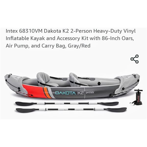 Inflatable 2-person kayak, heavy-duty vinyl, includes oars, air pump, carry bag, gray/red, new.