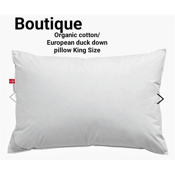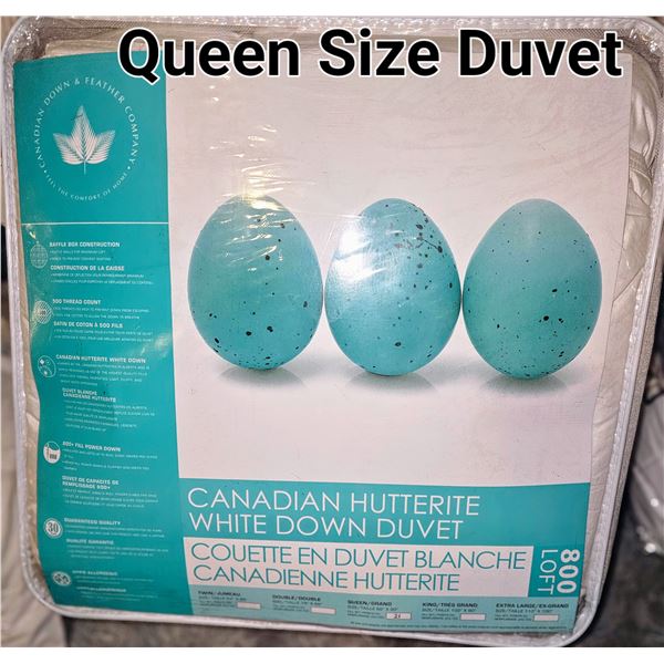 Queen-sized white down duvet with 500 thread count cotton shell, baffle box construction, new.