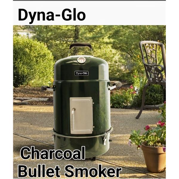 Vertical charcoal bullet smoker for outdoor cooking, designed with built-in thermometer, new.