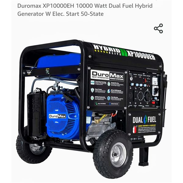 Duromax XP10000EH, 10000 watt, dual fuel capability, includes electric start, versatile power solution, new.