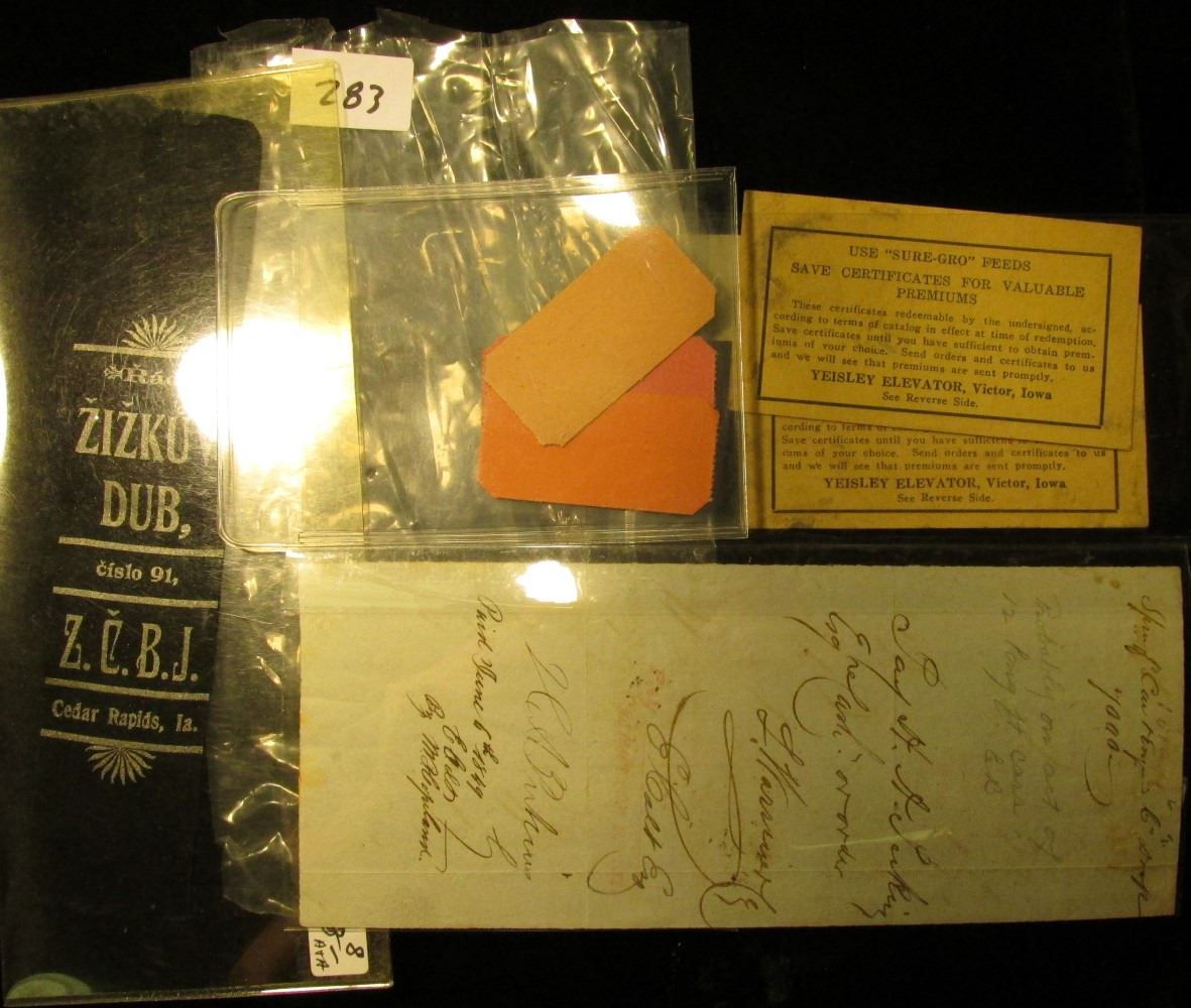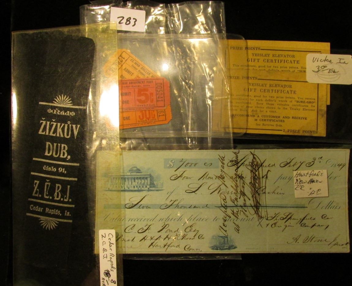Feb. 3rd, 1849 $7,000.00 check from Hartford & New Haven Rail Road; Pair of "Yeisley Elevator Gift Certificate…" Scrip notes; Black Silk ribbon with silver lettering "Z.C.B.J. Cedar Rapids, Ia."; & a group of CE-Mar Amusement Park & Roller Ring Tickets.