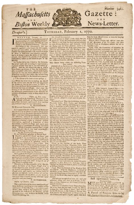 high... and just about one short month later the “Boston Massacre” occurred. All of this history in the making being printed right upon the front page, and as reported and presented in the local Boston newspaper.