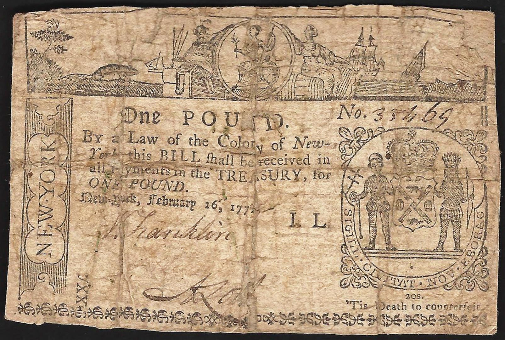 One February 16, 1771 New York One Pound Colonial Currency Note.