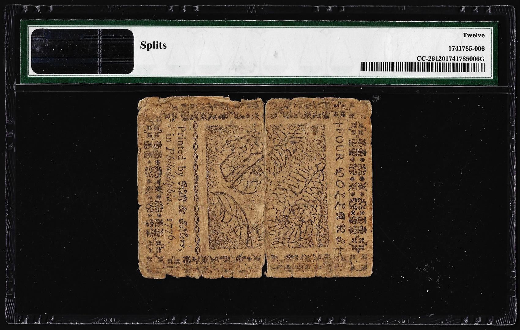 One February 17, 1776 $4 Continental Currency Note Fr.CC-26 PMG Fine 12. PMG Certified.
