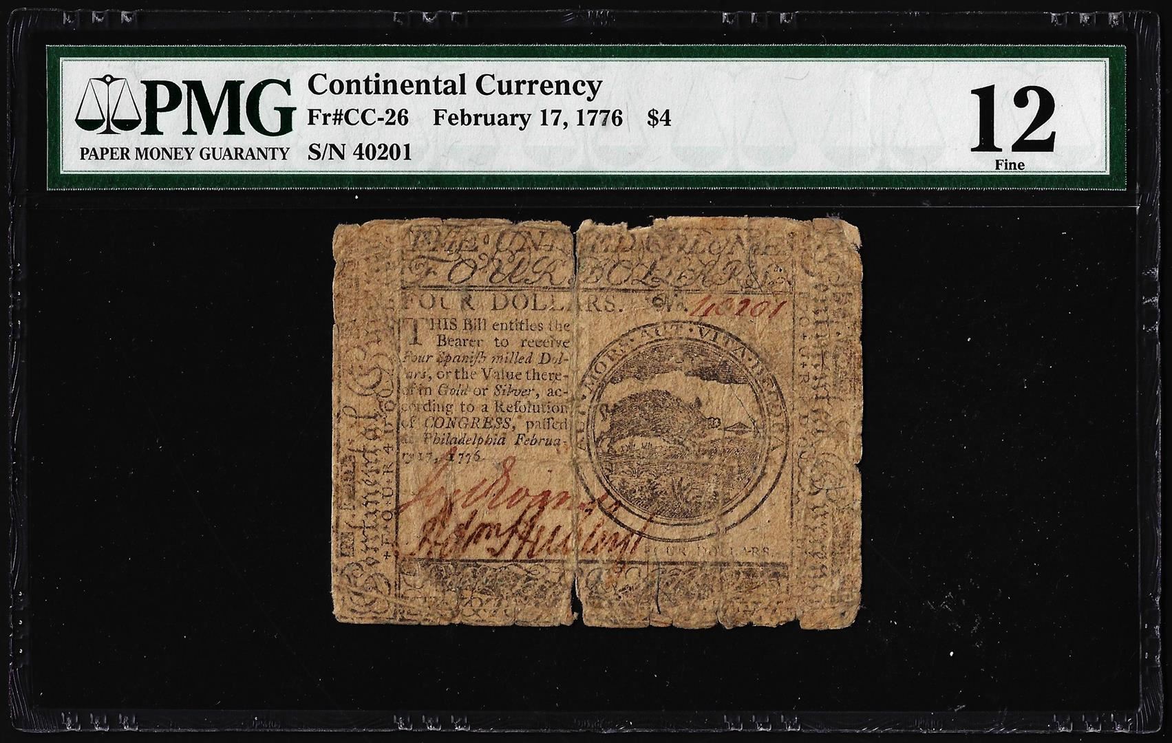 One February 17, 1776 $4 Continental Currency Note Fr.CC-26 PMG Fine 12. PMG Certified.