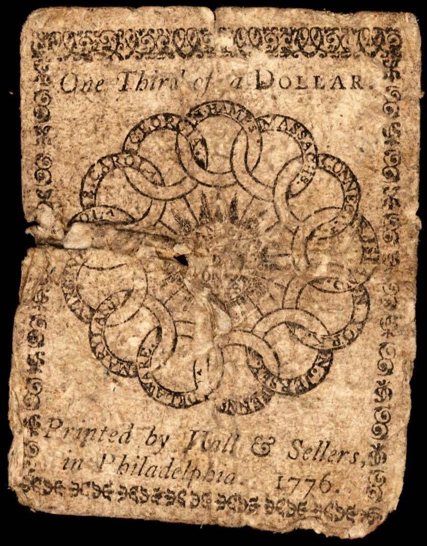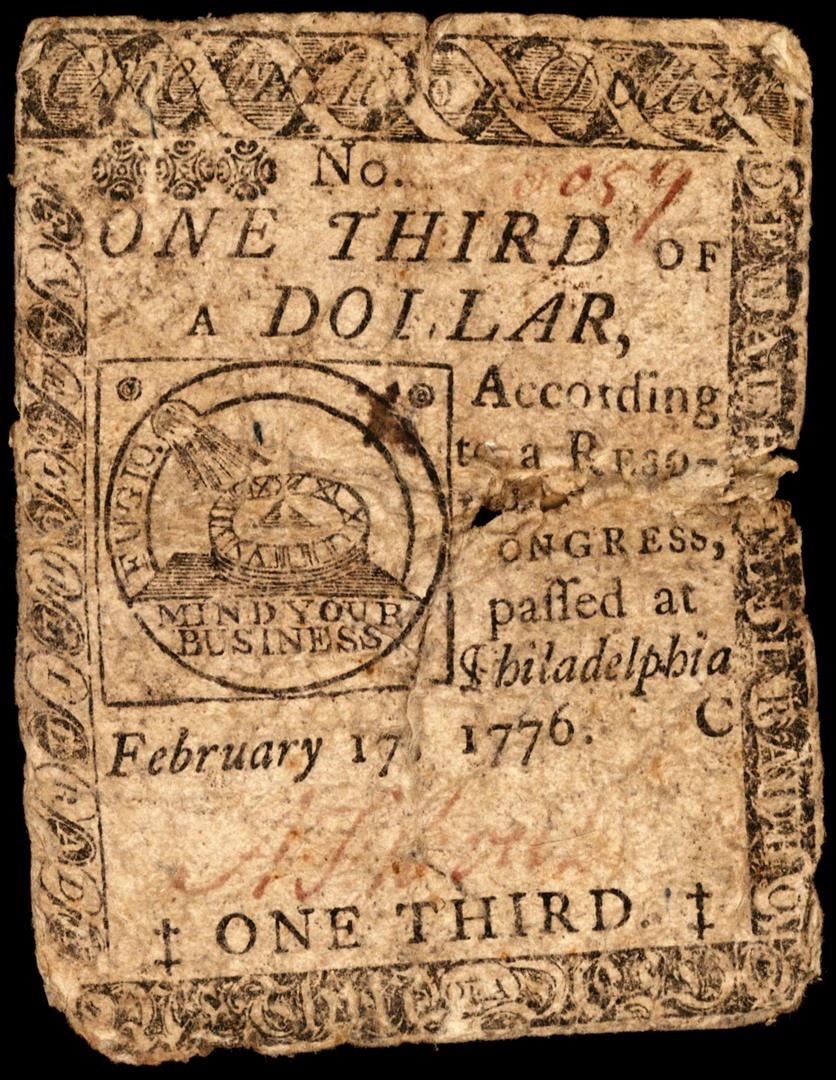 One February 17, 1776 Philadelphia $1/3 Colonial Currency Fugio Note.