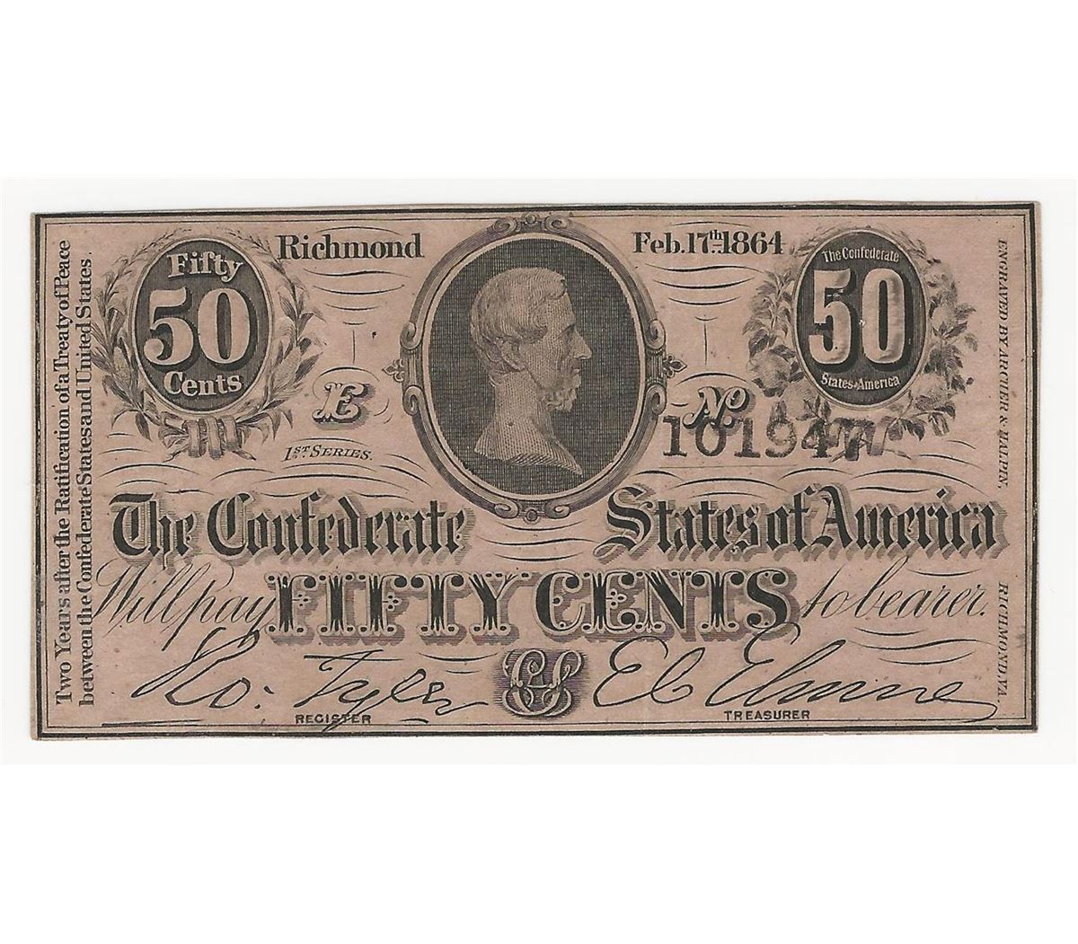 One February 17, 1864 Fifty Cents Confederate State of America Note.