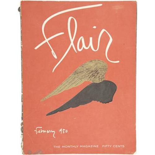 <B>February 1950 Issue 1, Volume 1 of Flair Magazine.</B></I> Perhaps one of the earliest "hipster" magazines covering the world of art, fashion, decor, travel and current fiction. Includes an article by W. H. Auden on Jean Cocteau, Cocteau's "A Letter to America", and an original work of fiction by Tennessee Williams titled "The Resemblance Between a Violin Case and a Coffin". The binding is slightly shaken thus the first several pages have become disbound and the spine is slightly frayed, else good condition.<BR><BR><BR><b>Shipping:</b> Books & Catalogs (<a target="_blank" href="http://www.heritageauctions.com/common/shipping.php">view shipping information</a>)