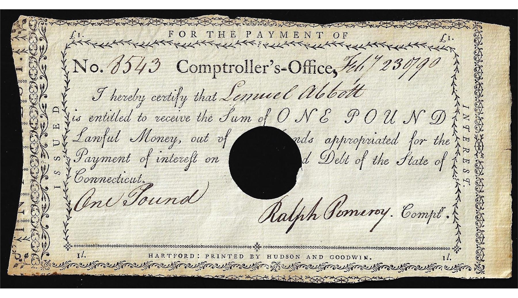 February 23, 1790 State of Connecticut Interest Certificate Colonial Note