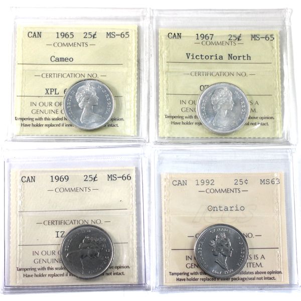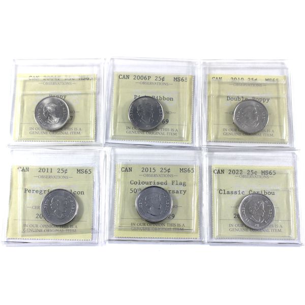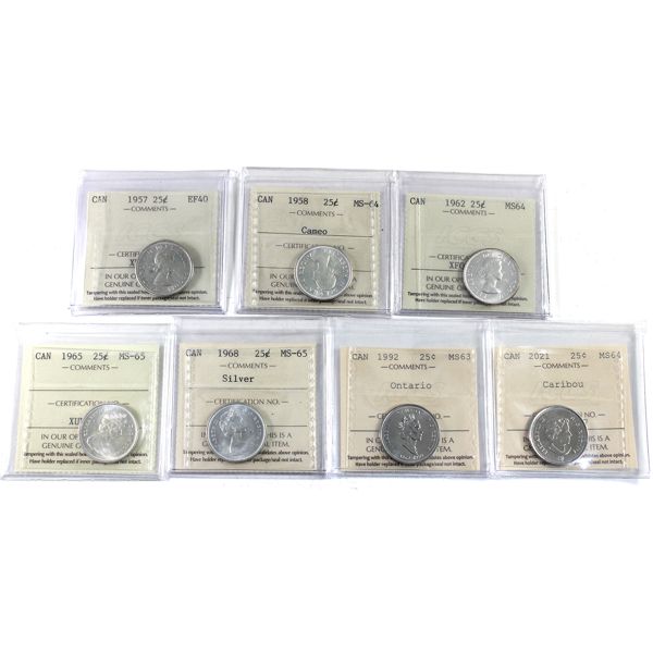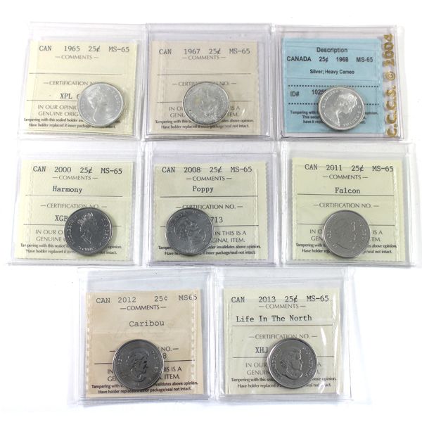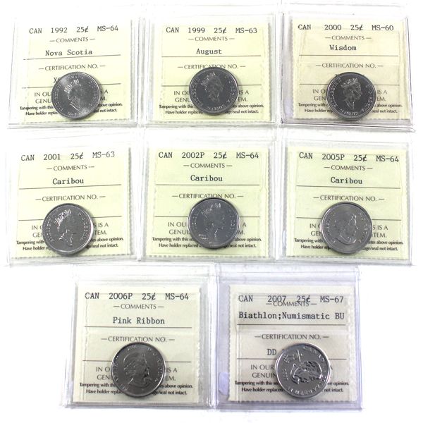 25-cent 1992-2007 ICCS MS60-67. INCLUDES: 1992 Nova Scotia MS64, 1999 August MS63, 2000 Wisdom MS60, 2001 MS63, 2002P MS64, 2005P MS64, 2006P Pink Rib