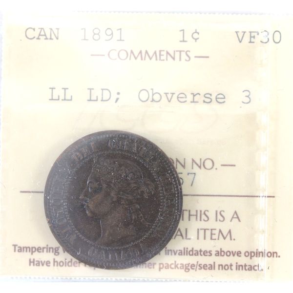 1-cent 1891 LL LD, Obverse 3 Repunched N ICCS VF30