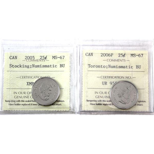 25-cent 2005 Stocking NBU & 2006 Toronto Maple Leafs NBU Both ICCS MS67. 2pcs.