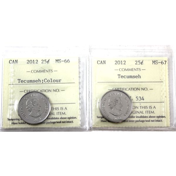 25-cent 2012 Tecumseh MS67 & Tecumseh Colour MS66 Both ICCS. 2pcs.