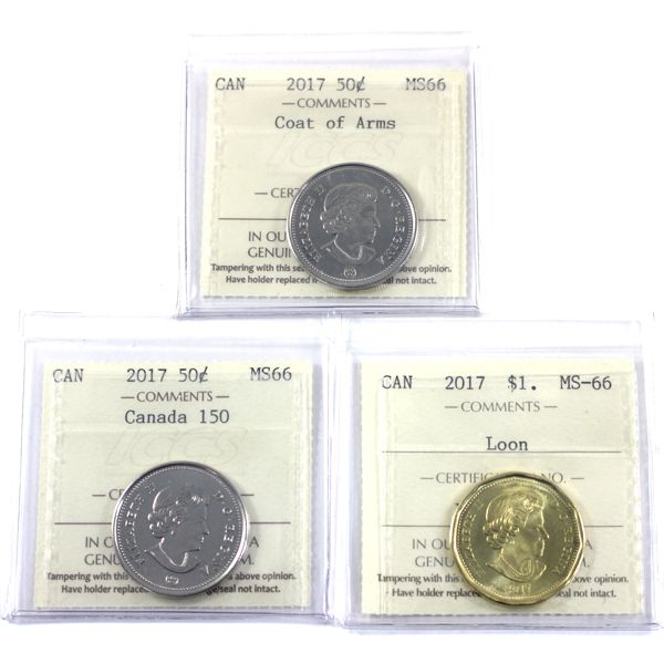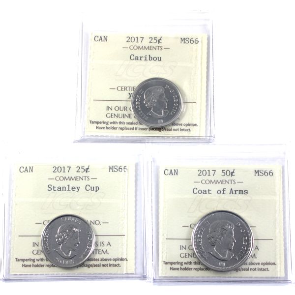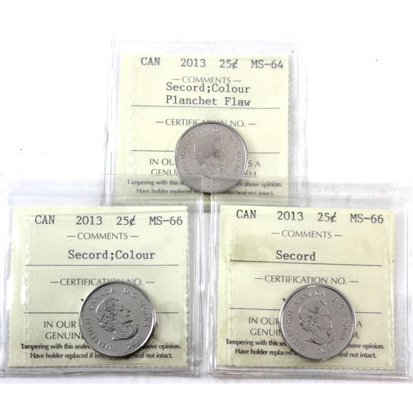 25-cent 2013 Secord Colour Planchet Flaw, Secord Colour & Secord All ICCS MS66. 3pcs.