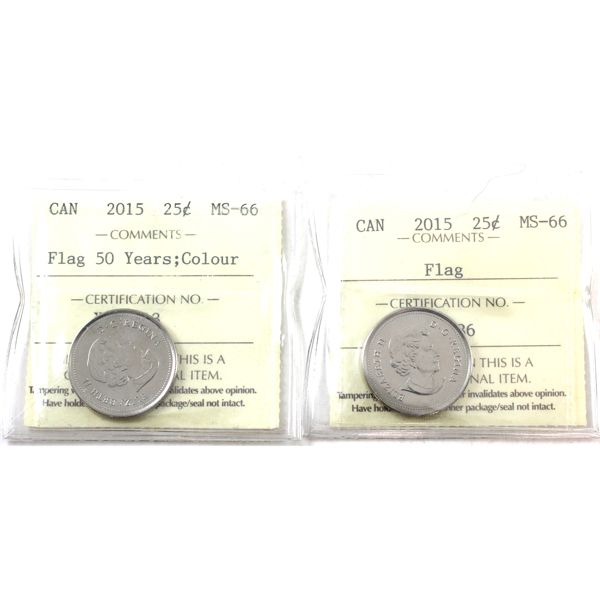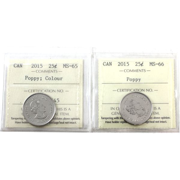 25-cent 2015 Poppy MS66 & Poppy Colour MS65 Both ICCS. 2pcs.
