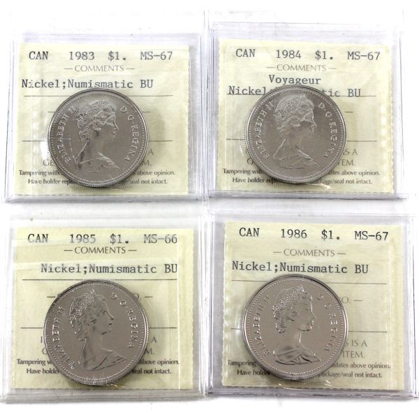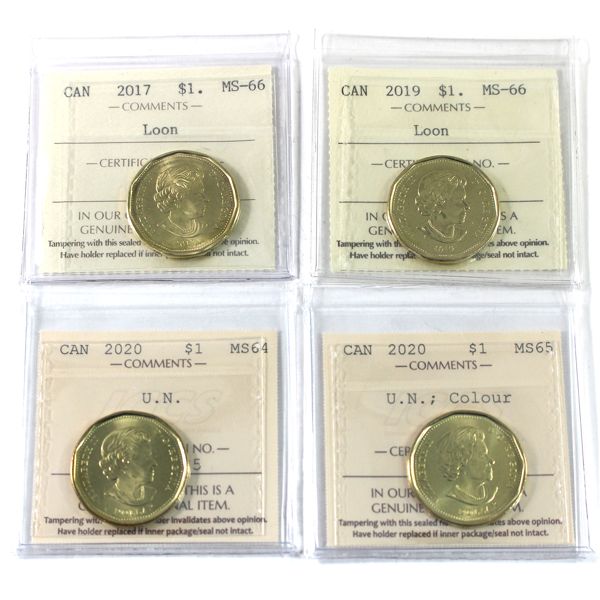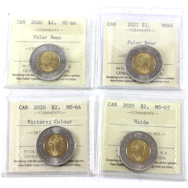 $2 2020 Polar Bear MS66, Haida MS65, Victory Colour MS64 & 2021 Polar Bear MS66 All ICCS. 4pcs.