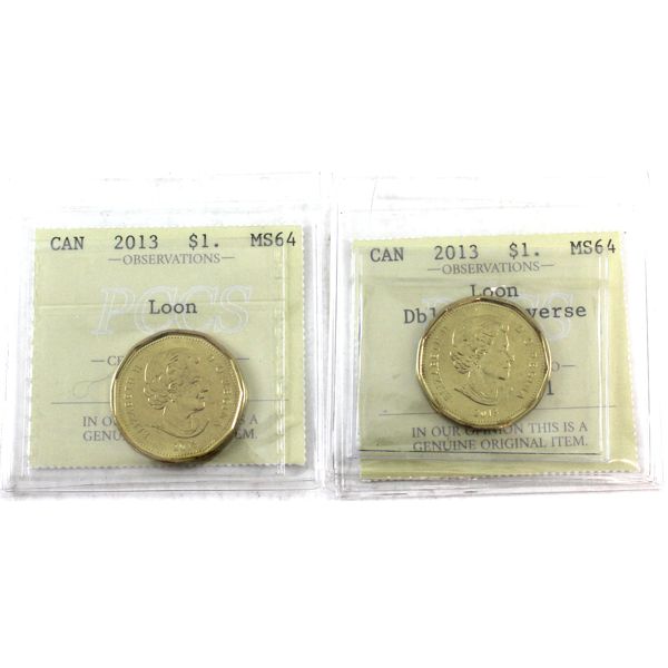 Loon $1 2013 & 2013 Double Die Reverse PCCS (Professional Coin Certification System) MS64. 2pcs